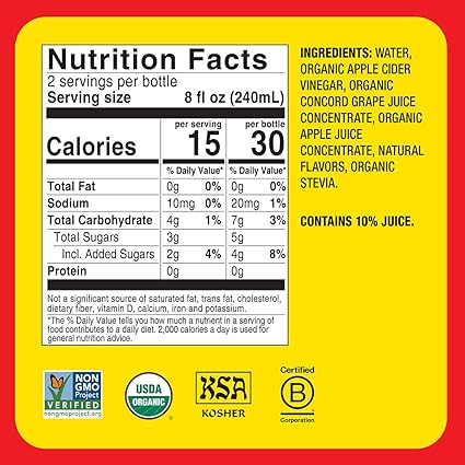 A blend of original, organic cider vinegar with Concord Grape juice and hibiscus for a sweet and flavorful refreshment. Naturally fermented by the ‘Mother'; Each bottle provides two servings of 750mg of Acetic Acid. Easily incorporate ACV into your diet—no need to add water! Enjoy your daily dose of ACV with ready-to-drink Bragg Apple Cider Vinegar Refreshers.
