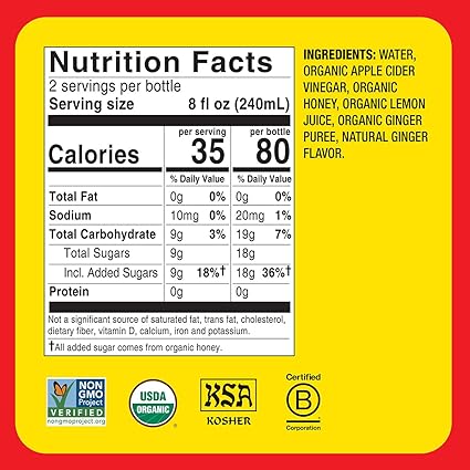 A blend of original, organic cider vinegar with organic ginger, lemon, and honey for a sweet and flavorful refreshment. Naturally fermented by the ‘Mother'; Each bottle provides two servings of 750mg of Acetic Acid. Easily incorporate ACV into your diet—no need to add water! Enjoy your daily dose of ACV with ready-to-drink Bragg Apple Cider Vinegar Refreshers.