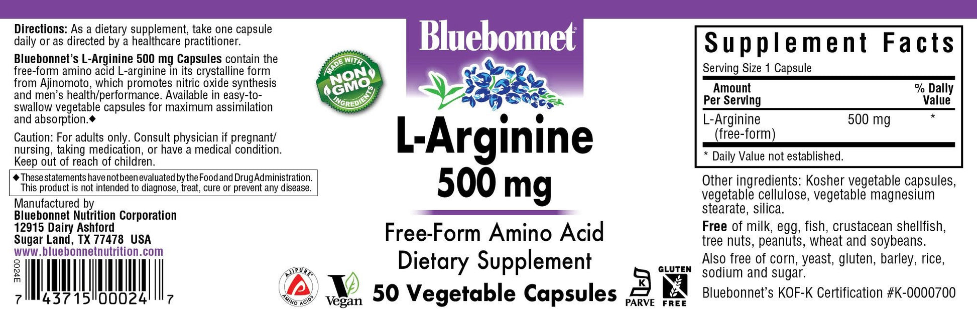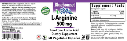 Bluebonnet's L-Arginine 500 mg Capsules contain the free-form amino acid L-arginine in its crystalline form, which promotes nitric oxide synthesis and men's health and performance.