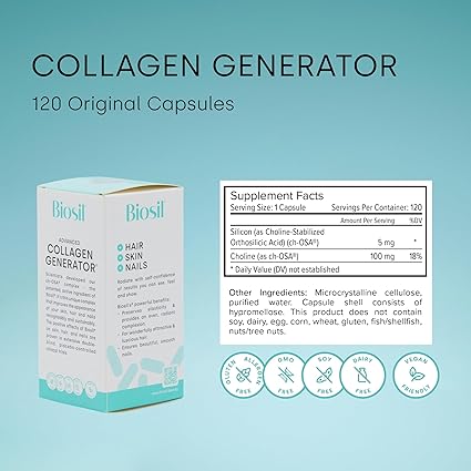 The ch-OSA in Biosil Collagen Generator increases collagen, keratin, and elastin levels in your body. The result? Less wrinkles, glowing skin, luscious hair, and seriously strong nails. The only active ingredient in this formula is ch-OSA, our patented and uniquely effective compound. The two other ingredients are purified water and microcrystalline cellulose (plant fiber). Collagen Generator increases your collagen levels by activating collagen production and by protecting existing collagen from degradation. Collagen Generator is vegan friendly & free of GMOs, soy, dairy, egg, corn, wheat, gluten, fish/shellfish, peanuts/nuts/tree nuts, animal-derived ingredients, artificial colors or preservatives, or any flavors or sweeteners.