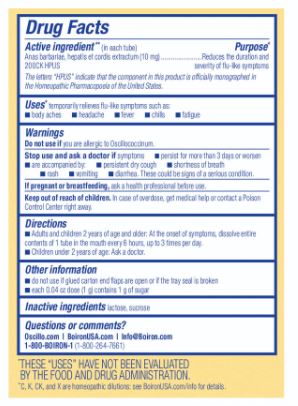 The moment you feel achy or run down, take Boiron Oscillococcinum and feel like yourself again. Clinical studies show that Oscillococcinum reduces the duration and severity of flu symptoms such as body aches, headache, fever, chills, and fatigue. 1-2 Easy to take, the meltaway pellets dissolve under the tongue and are recommended for everyone ages 2 and up.