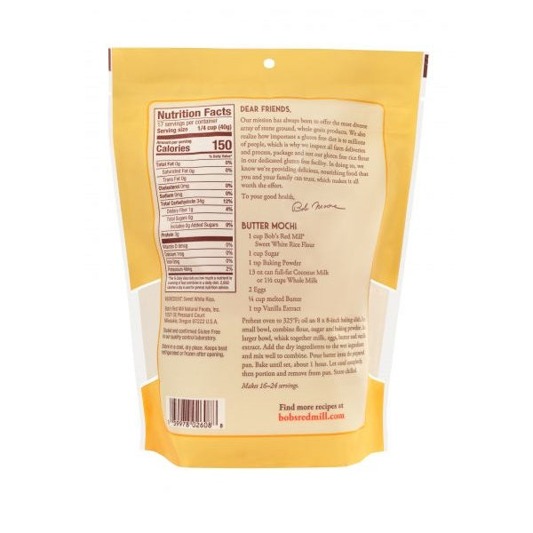 Bob's Red Mill Sweet White Rice Flour is 100% stone ground from high-starch, short-grain glutinous rice. It has a fine texture and neutral flavor, making it ideal for gluten free baked goods and to thicken sauces. It’s also used to create rice noodles and mochi.