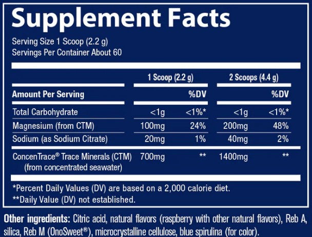 ConcenTrace® Daily Mineral Powder provides a full spectrum of naturally occurring trace minerals you may be missing from your diet in a delicious daily drink mix. These minerals support optimal energy, calm mood, healthy metabolism, nerve and muscle function, and overall wellness. A dash of antioxidant-rich blue spirulina provides the vibrant blue color.
