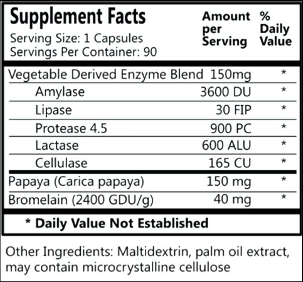 Daily's VegeZyme™ is a powerful, all natural vegetarian, enzyme supplement. VegeZyme™ allows vegetarians to enjoy optimal digestive health while maintaining a strictly vegetarian supplement program. One capsule provides: Vegetable derived Enzyme blend 150 mg, Amylase 3600 DU, Lactase 600 ALU, Protease 4.5 900 PC, Lipase 30 FIP, Cellulase 165 CU, Bromelain 40 mg & Papaya 150 mg.