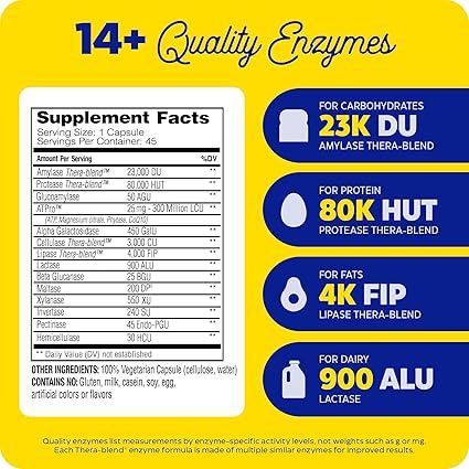 Savor your favorite dishes worry-free; Our full-strength, bloat-busting digestive enzyme blend helps break down large meals faster, easing bloating and occasional indigestion for care-free indulgence. Beat the post-meal blues and feel fueled with energy to power through your day; This unique formula features ATPro, a proprietary blend of ATP, Magnesium Citrate, Phytase and CoQ10 that helps fuel your body's cells. Our proprietary Thera-blend enzymes are formulated for optimal activity throughout the digestive system's varying pH levels, providing faster relief and maximum digestive support.