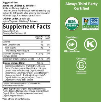 Trying to dislodge mucus and help soothe a cough is difficult. Cough & Mucus has a clean, Certified USDA Organic and Non-GMO Project Verified answer for you. With Organic English Ivy Leaf, a traditional remedy to help clear mucus when coughing, this immune syrup is designed specifically for cough and mucus. Also included are organic elderberry, zinc and vitamin C from organic acerola cherry for added immune system support.