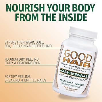 GOOD HAIR contains most of the vitamins and nutrients found in hair. These are the necessary nutrients that form the basis of healthy and strong hair, skin, nails and more. Lack of these nutrients can cause dull, dry, brittle, breaking, unhealthy and weak hair, skin, nails and many other health problems.