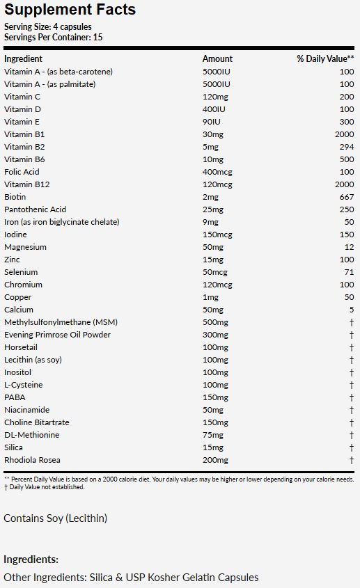 Four GOOD HAIR capsules per day provide the recommended daily allowance of essential vitamins, iron, most minerals plus MANY other nutrients. There is usually no need for other vitamins or food supplements with GOOD HAIR.