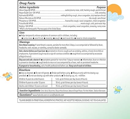 Naturally relieves the symptoms of the common cold including nasal and chest congestion, runny nose, sore throat, sneezing and cough in children ages 4-12. Natural grape-flavored syrup to relieve nasal congestion, runny nose, sore throat, sneezing and cough. Naturally relieves common cold symptoms including coughing, sneezing, sore throat, runny nose and nasal and chest congestion. Hyland's is committed to providing natural solutions for families at every stage of life. Hyland's formulas are made with natural active ingredients and have no known drug interactions.
