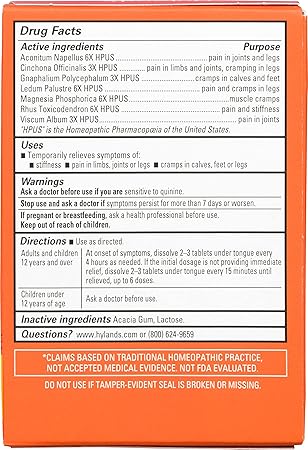 Natural relief of stiffness, pains in limbs, joints and legs, and cramps in calves, feet and legs. Quick-dissolving tablets that melt in your mouth instantly to relieve symptoms of pain and cramps in legs and calves, pain in limbs and joints, cramps in feet. Naturally relieves the symptoms of stiffness, pains in limbs, joints, legs and cramps in calves, feet and legs. Contains no aspirin, acetaminophen, ibuprofen or naproxen. Hyland's is committed to providing natural solutions for families at every stage of life. Our gentle homeopathic formulas are made with all natural active ingredients. There are no known side-effects and will not conflict with any medications you may be taking.