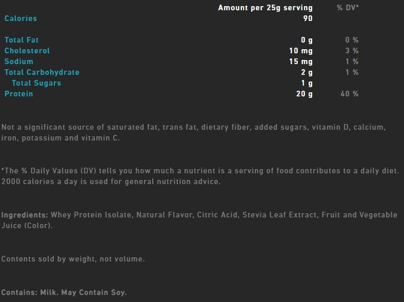 Isopure Infusions is a refreshingly light fruit flavored experience that delivers the protein you want without all the unnecessary ingredients you don’t. Give Isopure Infusions a vigorous shake and watch 20 grams of 100% whey protein isolate infuse into a colorfully translucent, refreshing drink right before your eyes. And what you see is what you get: 5 ingredients, no fat or added sugars and only 90 calories per scoop. No artificial flavors or colors and sweetened only with stevia leaf extract. Simple, powerful, and delicious.