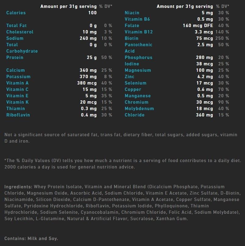 Pack in high-quality protein, without packing on the carbs. This zero carb protein (which also has ZERO sugar), supplies 25 grams of 100% pure whey protein isolate per scoop and added vitamins and minerals—to help you perform at your peak. It’s made with naturally occurring and added glutamine—and always without gluten, lactose or fillers.