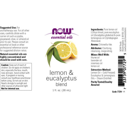 NOW Lemon & Eucalyptus Oil Blend consists of pure lemon, eucalyptus and lemongrass oils only, created through a cold-pressed process. Natural essential oils are highly concentrated and should be used with care. This citronella-like blend mixes well with thyme, lavender, rosemary and lemon oil.