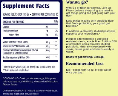 Let’s Go Fiber+ Tropical delivers what you need for daily regularity and gut health: prebiotic fiber that feeds probiotics (good gut bacteria), plus a postbiotic for your microbiome. With fermentable, upcycled resistant starch, acacia fiber, 1 billion CFU probiotics and a clinically studied postbiotic. Ready to get moving? Let’s go!