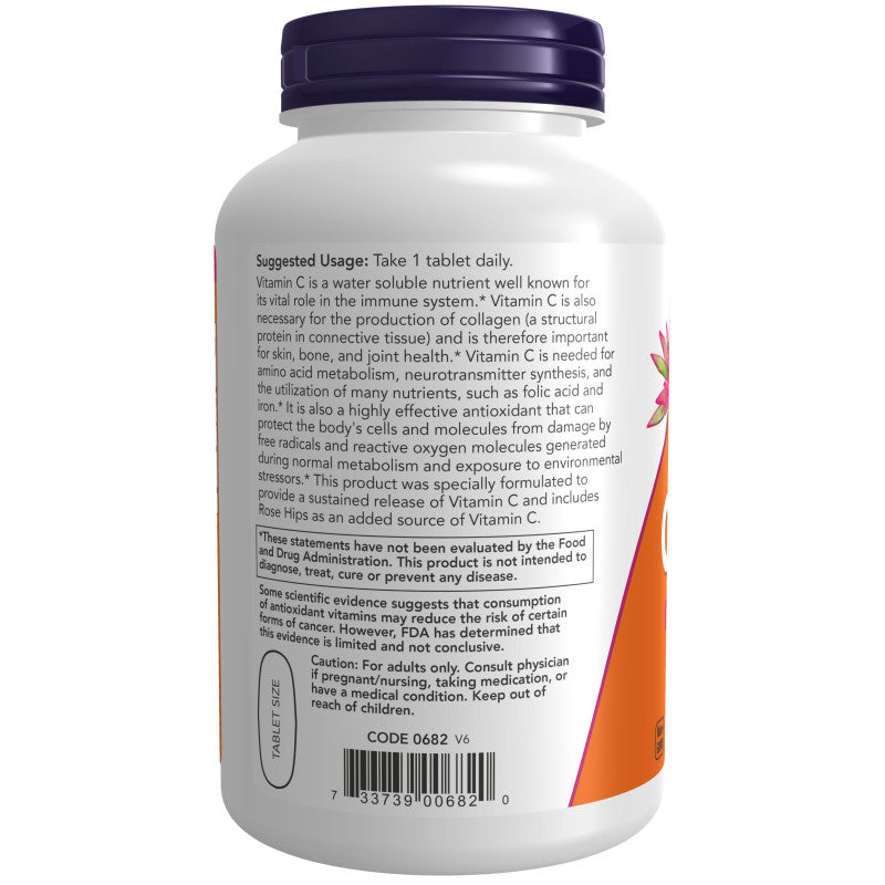 Now Vitamin C-1000 was specially formulated to provide a sustained release of vitamin C and includes rose hips as an added source of vitamin C. Vitamin C is a water soluble nutrient well known for its vital role in the immune system. Vitamin C is also necessary for the production of collagen (a structural protein in connective tissue) and is therefore important for skin, bone, and joint health. Vitamin C is needed for amino acid metabolism, neurotransmitter synthesis, and the utilization of many nutrients, such as folic acid and iron. It is also a highly effective antioxidant that can protect the body's cells and molecules from damage by free radicals and reactive oxygen molecules generated during normal metabolism and exposure to environmental stressors.