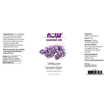 NOW Lavender Oil consists of 100% pure and certified organic lavender oil only, created through a natural distillation process, offering the purest and most potent natural essential oil available. Natural essential oils are highly concentrated and should be used with care. When your head feels THIS big try Head Ease Blend: Add 3 drops each of lavender oil, peppermint oil and chamomile oil to a diffuser and enjoy.