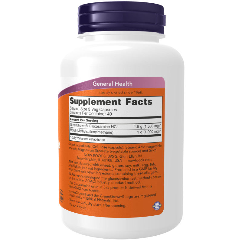 NOW® Vegetarian Glucosamine & MSM combines two well-known joint support ingredients in a vegetarian/vegan friendly formula that does not include shellfish-derived glucosamine. Glucosamine is an essential building block for the formation of glycosaminoglycans (GAGs) and proteoglycans, the main components of cartilage tissue. These compounds attract water to form a joint cushion, providing lubrication and shock absorption. MSM (Methylsulfonylmethane) is an organic form of sulfur, a mineral necessary for the production of GAGs and proteoglycans.