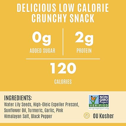 AshaPops Popped Water Lily Seeds offer a nutrient-rich, gluten-free, vegan, and Paleo snack alternative. Turmeric Garlic flavor features Asha's homemade blend of Turmeric with Himalayan Pink Salt, Garlic & Black Pepper. This flavor contains no sugar and only 4 ingredients! AshaPops are a guilt-free snack for health-conscious consumers. Endorsed by Ayurveda, AshaPops are a guilt-free Ayurvedic snack, free from nuts, corn, soy, and GMOs. Delight in the bold and earthy turmeric garlic flavor, combining the warmth of turmeric with the savory richness of garlic, while aligning with your holistic wellness goals. With only 120 calories per 1 oz pack, AshaPops deliver a satisfying crunch without the guilt. Swap traditional snacks like popcorn, chips, or puffs for this low-fat, low-calorie delight.