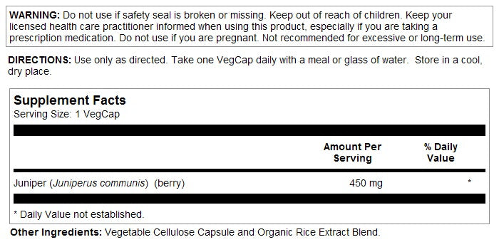 Juniper Berries are rich in antioxidants and contain flavonoids and polyphenols. These berries may work as a diuretic to reduce excess water in the body. Juniper Berries may also work as an anti-inflammatory to help with joint pain. Each capsule contains 450mg Juniper.
