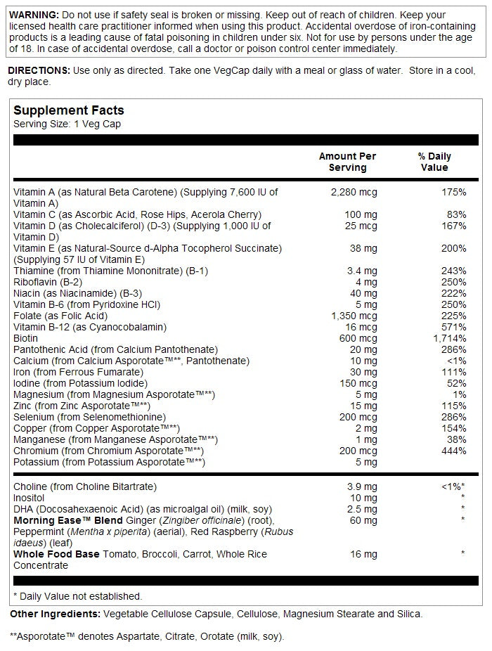Whether you are trying to conceive, already expecting, or breastfeeding, Solaray Once Daily Prenatal Multivitamin is formulated to provide nutritional support for both you and your baby in one, convenient VegCap serving. Complete with vitamins and minerals from A to Z, Solaray's formula includes 100% DV of folic acid which has been shown to support healthy fetal and spinal cord formation. Important to healthy brain and eye development, this multivitamin also includes omega-3 DHA which may provide continued support if it is passed from mom to baby through breastfeeding. Lastly, this complete prenatal vitamin is formulated with a Morning Ease Blend of ginger, peppermint, and red raspberry to comfort and soothe the digestive system.