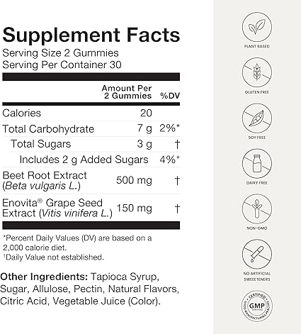 #1 Cardiologist, Doctor, and Pharmacist Recommended Beet Brand for Heart Health Support According to IQVIA ProVoice Survey June 2024. Nearly 2X More Effective Blood Pressure Support than diet and exercise alone from grape seed extract. Enjoy a boost of heart healthy energy without caffeine or stimulants. Support healthy blood flow and circulation. SuperBeets Heart Gummies (Strawberry) are pectin based and vegan friendly. They are strawberry flavor with no fillers, no binders, just a pleasant taste and potent active ingredients.
