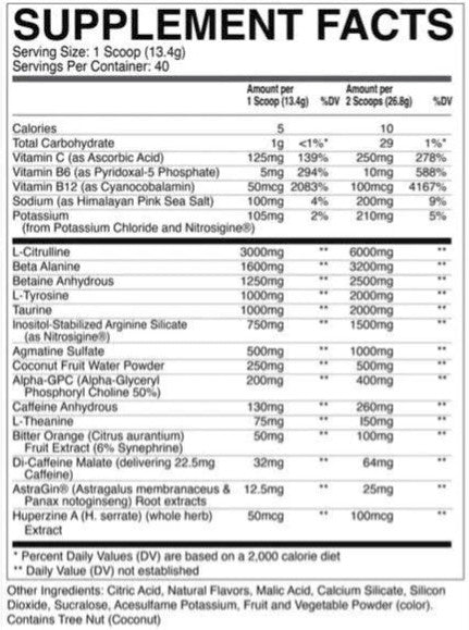 Suggested use: Mix 1 scoop with 6-8oz of water and drink 20-30 minutes before workout