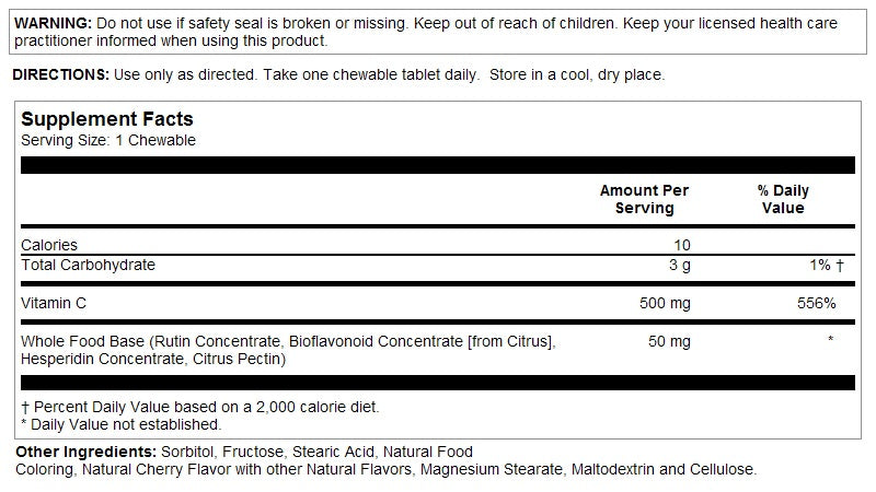 Solaray Vitamin C Chewables provide a tastier way to get your daily Vitamin C. These Cherry flavored chewable tablets contain 500mg of Vitamin C and 50mg of a whole food base that is intended to enhance the activity of Vitamin C and provide hair, skin, and nail support.